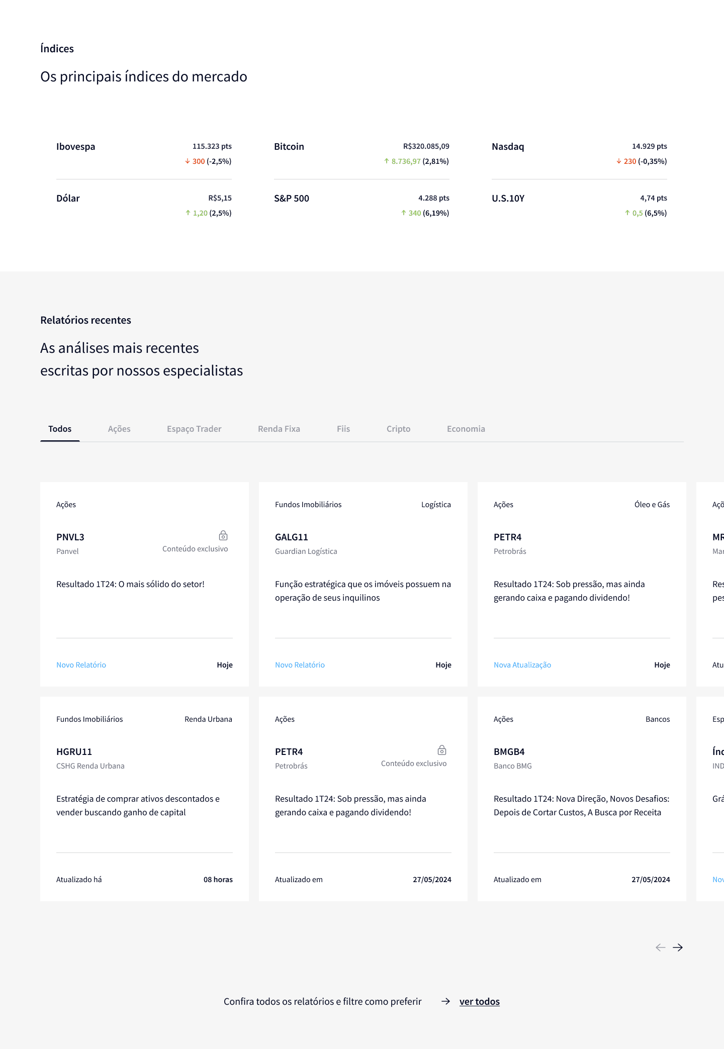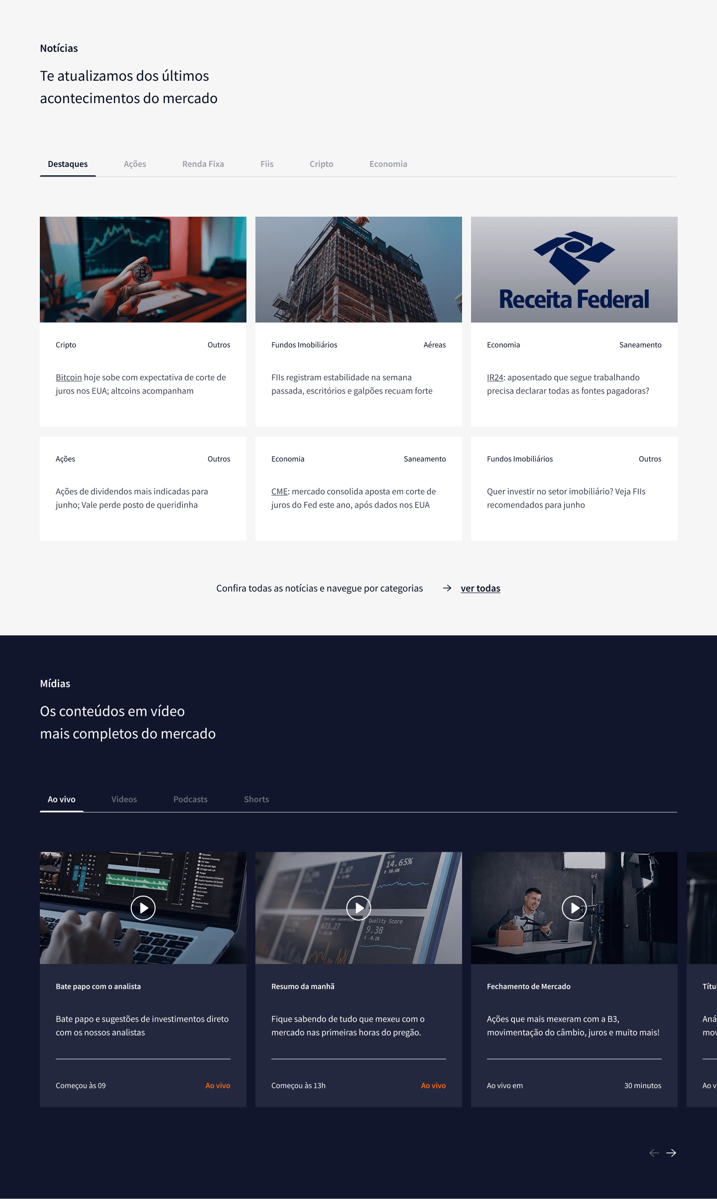 O conteúdo foi organizado por temas, sessões e categorias, apresentando apenas as informações essenciais para um entendimento claro, rápido e preciso. A navegação foi construída com cards e abas, garantindo um visual clean e objetivo. Os principais acontecimentos do mercado passaram a ser exibidos em tempo real, distribuídos de forma estratégica ao longo do blog, facilitando o acesso à informação no momento certo.